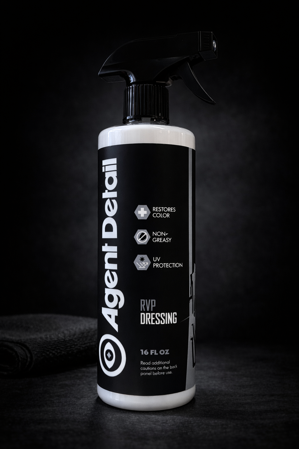 Our RVP dressing hydrates and restores rubber, vinyl, and plastic surfaces with a clean satin finish—never greasy, safe for interior and exterior use. It keeps trim, consoles, and panels conditioned, protected, and looking refined with every application.
